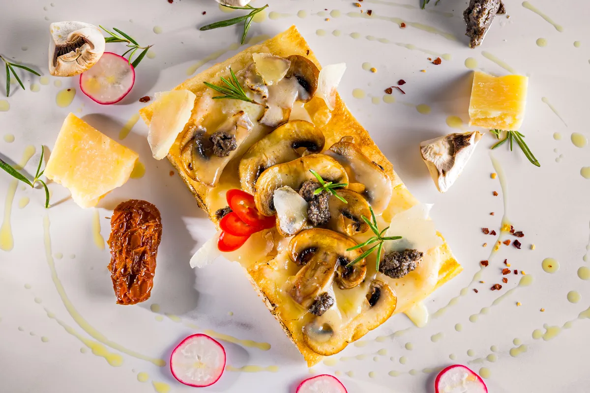Fluffy foccacia, mortadella cu fistic, rosii uscate, crema de branza, pesto de busuioc, rucola, ulei de masline extravirgin, fistic